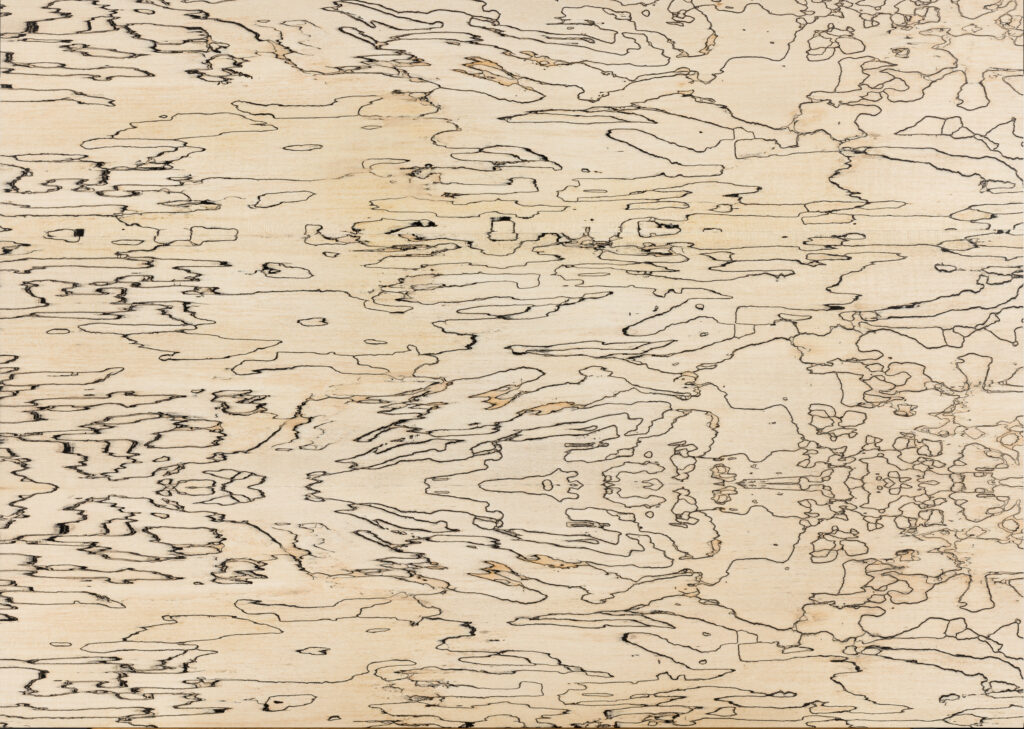 Ein durch Myzel veredeltes Holz, das durch biologische Prozesse marmorierte Strukturen bildet – kontrolliert kultiviert, natürlich gewachsen.